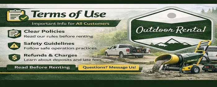 These Terms of Use and Rental Terms and Conditions (“Terms”) govern your access to and use of Outdoor Rental’s website, booking pages, delivery/pickup services, and equipment rentals (including but not limited to pressure washers, concrete mixers, and related accessories). “Outdoor Rental,” “we,” “us,” or “our” refers to Outdoor Rental. “You” or “Renter” refers to the individual or entity renting equipment from us.